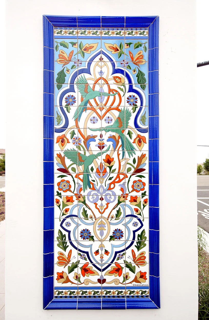 I designed a series of twelve colorful tile murals that were inspired by the traditional “cuerda seca” tile making method reminiscent of tiles produced many centuries ago in the Near and Middle East, North Africa, and Southern Spain. This style of tile was first introduced to the American public in San Diego at the Panama California Exposition in 1915. The aesthetic these tiles represented had an immediate appeal to architects and homeowners as they blended beautifully into the increasingly popular Spanish Colonial Revival architecture, a style that is iconic to California and has influenced the architecture of the Village at Pacific Highlands Ranch. The murals range is size from 18” x 24” to 6’x12’ second story archway murals. Imagery used in the illustrations reflects the carmel valley setting and includes morning doves, poppies, and roosters from the original “ranch”.
